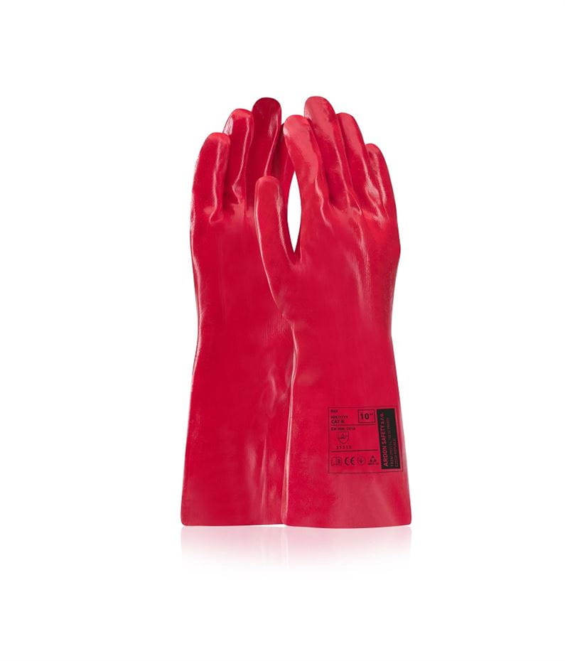 Wykonane z poliestru powlekanego w całości PVC, w kolorze czerwonym. Fason pięciopalcowy z wydłużonym mankietem, który skutecznie chroni część przedramienia. Wykazują odporność na oddziaływania mechaniczne typu: przetarcie, rozdarcie, przecięcie, przekłucie, uderzenie. Powłoka rękawic jest szczelna. Nadają się do bezpiecznej pracy w wilgotnym i olejowym środowisku roboczym. Stosowane w rolnictwie, ogrodnictwie, leśnictwie, rybołówstwie.