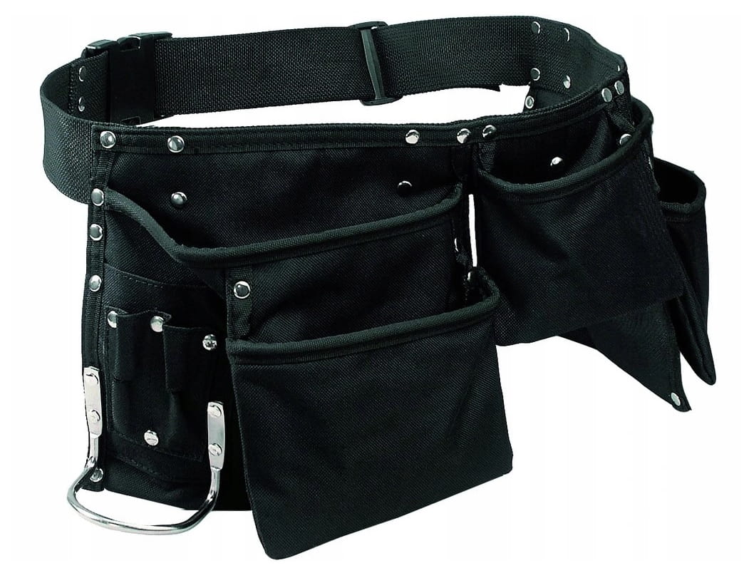 Tekstylny jednoczęściowy pas na gwoździe i metalową pętlą na narzędzia, dwukieszeniowy z paskiem, max. nośność 5 kg