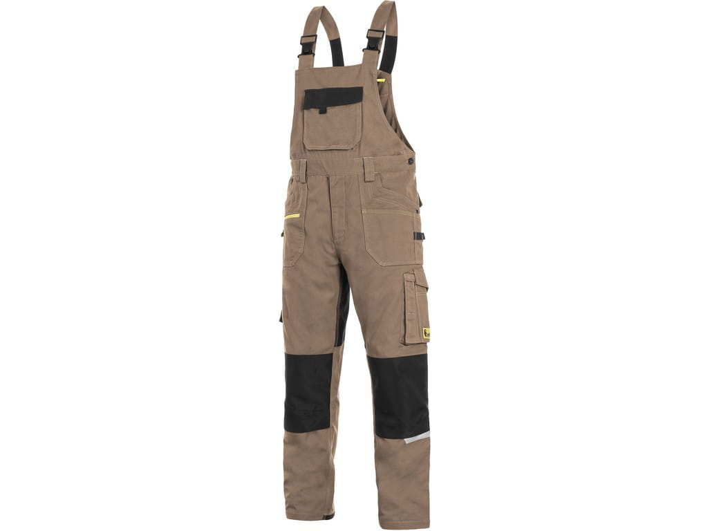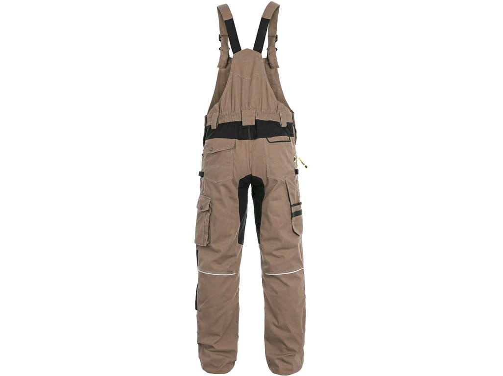 Ogrodniczki męskie, tkanina stretch zapewniająca swobodny ruch, kieszeń na piersi z klapką, szlufki na pasek, z przodu kieszonka na suwak, z boku kieszenie wielofunkcyjne, kolana wzmocnione poliesterem 600D z możliwością włożenia usztywnienia na kolana, dwie tylne kieszenie - jedna z klapką, dolna część nogawek wzmocniona poliesterem 600D, szelki z gumą z tyłu, odblaskowe akcesoria