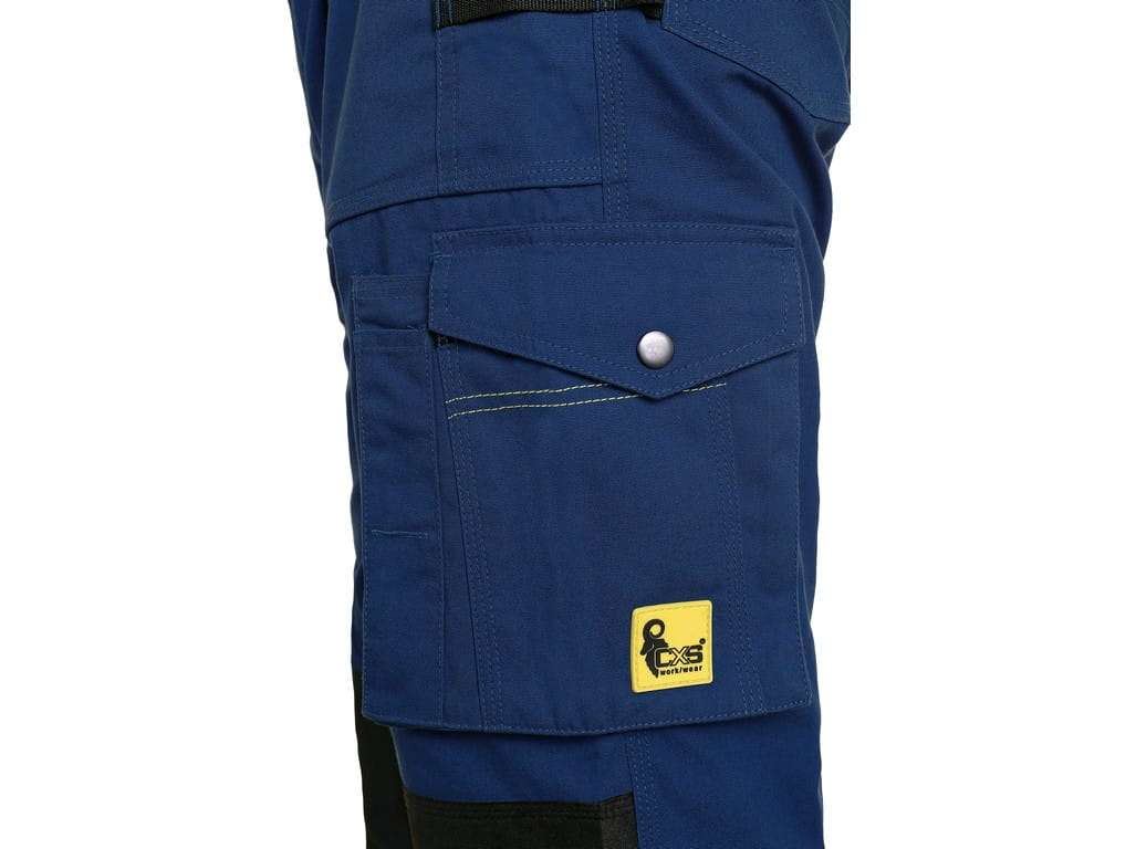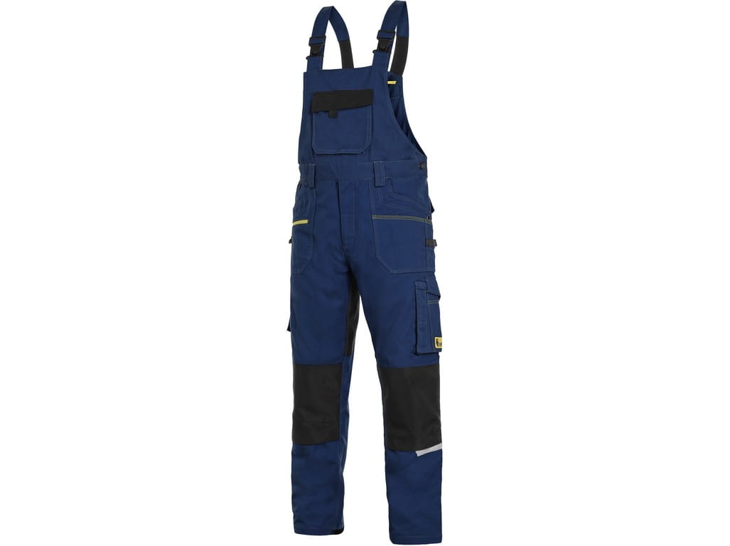 Ogrodniczki męskie, tkanina stretch zapewniająca swobodny ruch, kieszeń na piersi z klapką, szlufki na pasek, z przodu kieszonka na suwak, z boku kieszenie wielofunkcyjne, kolana wzmocnione poliesterem 600D z możliwością włożenia usztywnienia na kolana, dwie tylne kieszenie - jedna z klapką, dolna część nogawek wzmocniona poliesterem 600D, szelki z gumą z tyłu, odblaskowe akcesoria