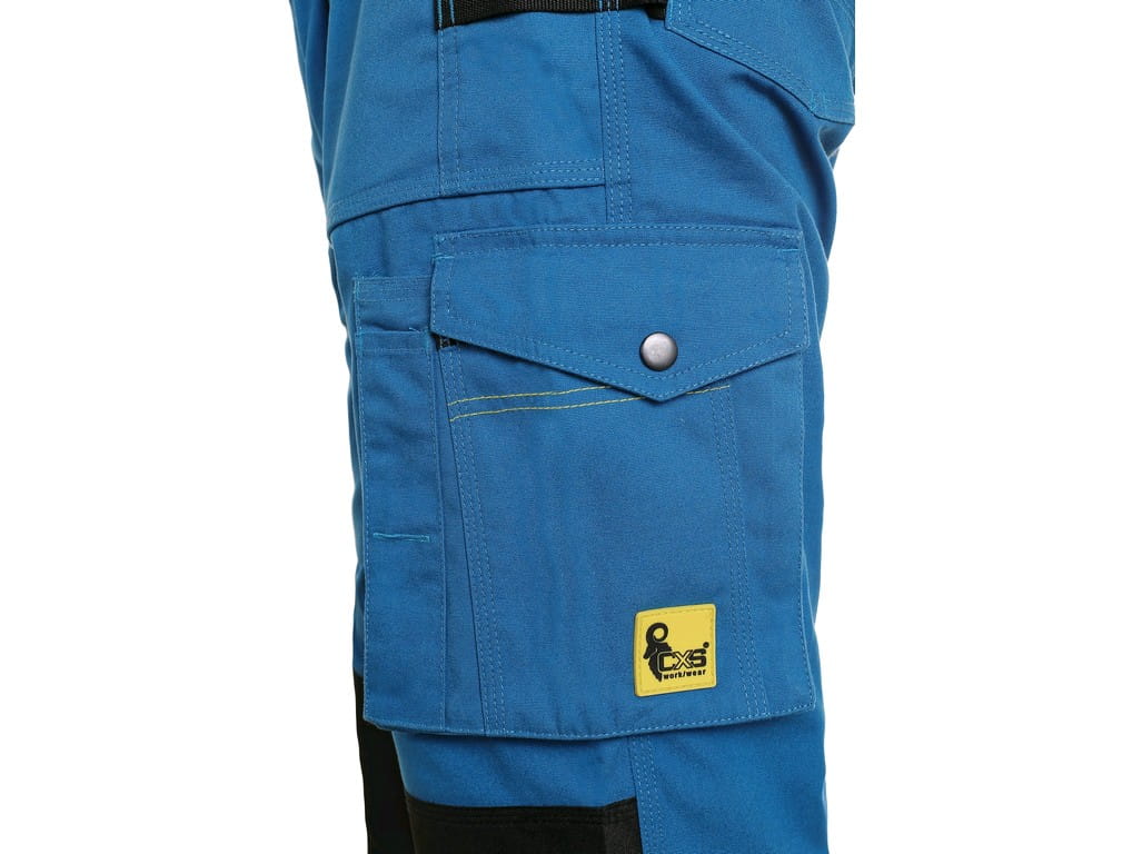 Ogrodniczki męskie, tkanina stretch zapewniająca swobodny ruch, kieszeń na piersi z klapką, szlufki na pasek, z przodu kieszonka na suwak, z boku kieszenie wielofunkcyjne, kolana wzmocnione poliesterem 600D z możliwością włożenia usztywnienia na kolana, dwie tylne kieszenie - jedna z klapką, dolna część nogawek wzmocniona poliesterem 600D, szelki z gumą z tyłu, odblaskowe akcesoria