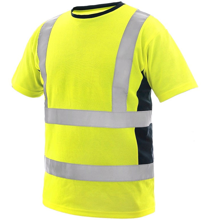 Wysokiej jakości t-shirt ostrzegawczy z naszytymi pionowymi i poziomymi pasami odblaskowymi. Kołnieżyk oraz panele boczne w granatowym kolorze. Odzież certyfikowana zgodnie z międzynarodową normą EN ISO 20 471- odzież ostrzegawcza o wysokiej widoczności do użytku profesjonalnego - kategoria II. Odzież certyfikowana zgodnie z międzynarodową normą EN ISO 13 688 – odzież ochronna.